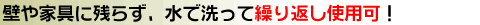 粘着面には、こだわりの強粘着ウレタンを使用していますので、取り外しても、壁や家具には粘着材が残りません。また、ほこりなどがついても、水で洗って乾燥させるとネバネバした強粘着力が復活し、再度使用できるのです。 |